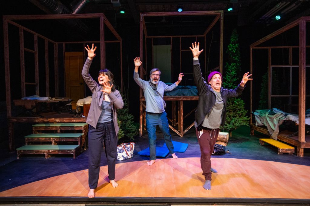 The participants are assigned two to a cabin. Set designer Keri King constructed three multi-level see-through square boxes, side by side on the stage. There are fir trees all around. The sound effects (babbling streams, falling rain, the growls of an otherworldly beast) enhance the sense of isolation.